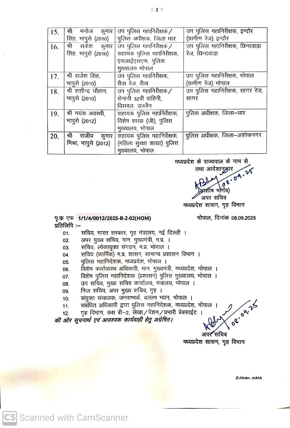 उप पुलिस महानिरीक्षक ग्रामीण रेंज इंदौर निमिष अग्रवाल को उप पुलिस महानिरीक्षक रतलाम रेंज, उप पुलिस महानिरीक्षक छिंदवाड़ा रेंज डी कल्याण चक्रवर्ती को उप पुलिस महानिरीक्षक पुलिस मुख्यालय भोपाल पदस्थ किया गया है। इसके अलावा अतिरिक्त पुलिस आयुक्त (अपराध एवं मुख्यालय) भोपाल पंकज श्रीवास्वत को उप पुलिस महानिरीक्षक पुलिस मुख्यालय भोपाल बनायागया है। उप पुलिस महानिरीक्षक पीआरटीएस इंदौर राजेश कुमार सिंह को अतिरिक्त पुलिस आयुक्त (अपराध एवं मुख्यालय) इंदौर बनाया गया है। उप पुलिस महानिरीक्षक एससीआरबी पुलिस मुख्यालय भोपाल हेमंत चौहान को उप पुलिस महानिरीक्षक छतरपुर रेंज भेजा गया है। उप पुलिस महानिरीक्षक/ वरिष्ठ पुलिस अधीक्षक रेडियो भोपाल विजय कुमार खत्री को उप पुलिस महानिरीक्षक छतरपुर रेंज नियुक्त किया गया है।