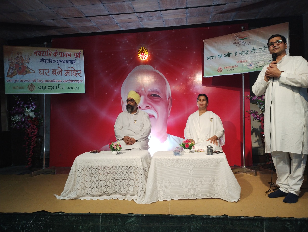 ग्वालियर : आज़ादी के अमृत महोत्सव से स्वर्णिम भारत की ओर थीम के अंतर्गत प्रजापिता ब्रह्माकुमारी ईश्वरीय विश्व विद्यालय की सहयोगी संस्था राजयोग एजुकेशन एंड रिसर्च फाउंडेशन के व्यवसाय एवं उद्योग प्रभाग द्वारा नवरात्री के पावन पर्व पर कार्यक्रम का आयोजन किया गयाl इस कार्यक्रम में मुख्य रूप से ब्रह्माकुमारीज़ लश्कर की मुख्य इंचार्ज ब्रह्माकुमारी आदर्श दीदी जी, ब्रह्माकुमार डॉ. गुरुचरण जी, ब्रह्माकुमार प्रहलाद उपस्थित थे l साथ ही व्यापारिक क्षेत्र से राजकुमार गंगवानी, संतोष वाधवानी, गिरधारी लाल, अशोक कुमार, सुरेश खत्री सहित अनेकानेक लोग उपस्थित रहे। कार्यक्रम में ब्रह्माकुमार डॉ.गुरुचरण ने सभी को नवरात्री का आध्यात्मिक रहस्य स्पष्ट किया तत्पश्चात जीवन के आवश्यक बातों को बताते हुए कहा कि आज जिस भी क्षेत्र की हम बात करें सबमें ट्रेनिंग मानो एक अहम् हिस्सा बन गया हैl तो उसी तरह से जीवन को जीने की भी ट्रेनिंग होती है उसे कहते है “आर्ट ऑफ़ लिविंग ” अर्थात किस रीती से हम अपने जीवन को अच्छे से अच्छा बना कर जिएं यह भी एक कला है l अगर महाभारत की बात करें तो कहते है ईश्वर ने सभी पांडवो को युद्ध के मैदान में ट्रैनिंग दी कि किस प्रकार युद्ध को लड़ना है और उस ज्ञान की वजह से ही पांडवो को जीत भी हासिल हुई उसी प्रकार आज स्वयं पिता परमात्मा भी हम सबको एक महत्वपूर्ण ट्रैनिंग दे रहे और वह है “आर्ट ऑफ़ लीविंग” अर्थात छोड़ना l परमात्मा हम सभी को शिक्षा दे रहे हैं की जो भी पुराने स्वाभाव – संस्कार हैं, पुरानी बातें हैं जिन्हें हम सभी ने आज तक पकड़कर रखा है उन्हें छोड़ना है l वर्तमान समय में बीमारी चिंता आदि बढ़ने का मुख्य कारण है की हमारे मन ने अभी तक उन बातों को, संस्कारो को पकड़ कर रखा है इसीलिए हमारे तन को भी आदत हो गयी है बीमारियों को पकड़ कर रखने की l परन्तु अगर अपने मन को और तन को स्वस्थ बनाना चाहते हैं तो “आर्ट ऑफ़ लिविंग ” के साथ साथ “आर्ट ऑफ़ लीविंग” पर भी काम करना अनिवार्य है तब आपका जीवन स्वतः ही श्रेष्ठ और खुशहाल बन जायेगा l ब्रह्माकुमारी आदर्श दीदी जी ने सभी को नवरात्री के पावन पर्व की शुभकामनाएं दीं और बताया कि वर्तमान समय की बात की जाए तो व्यक्ति अपने कारोबार में इतना व्यस्त हो गयें है की स्वयं के लिए ही समय निकालना बहुत मुश्किल लगता है l आज कारोबार में एक बात जो बहुत सुनने में आती है कि व्यापार करते - करते लोग एक दूसरे को धोखा दे देते हैं, क्योंकि लोगो की सोच ऐसी हो गयी है कि मैं सामने वाले से ज़्यादा धनवान कैसे बनूँ और उसके लिए गलत तरीके से धन कमाने लग जाते हैं, यही फिर व्यक्ति के जीवन में अशांति एवं दुख का कारण बनता है। इसलिए सभी को आज अच्छा जीवन जीने के लिए सही मार्गदर्शन की आवश्यकता है l सबसे 