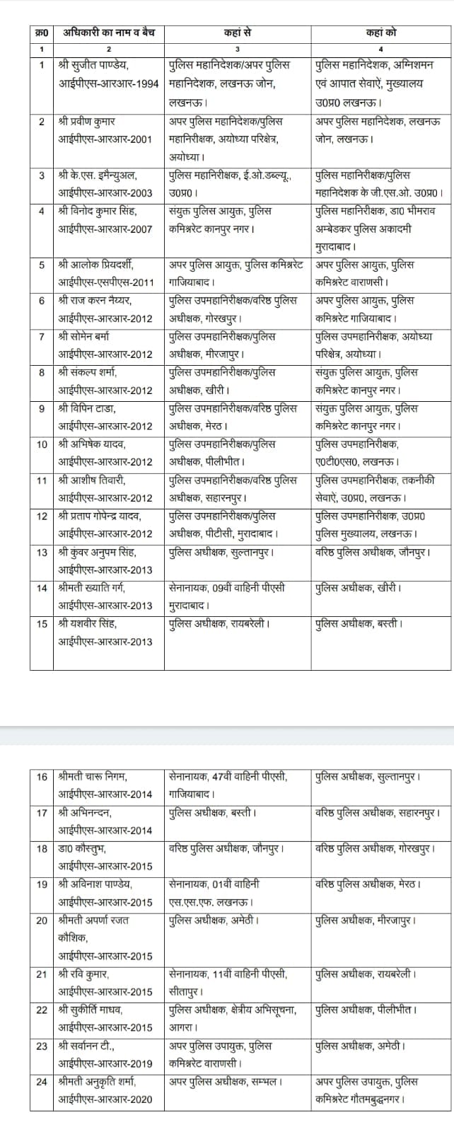 उत्तर प्रदेश सरकार ने बुधवार की देर रात पुलिस महकमे में एक बड़ी प्रशासनिक सर्जरी करते हुए 24 वरिष्ठ आईपीएस अधिकारियों के तबादले कर दिए हैं। मुख्यमंत्री योगी आदित्यनाथ के निर्देश पर जारी हुई इस सूची में न केवल मुख्यालय स्तर के बड़े अधिकारियों की जिम्मेदारी बदली गई है, बल्कि अयोध्या रेंज के आईजी सहित 11 महत्वपूर्ण जिलों के पुलिस कप्तान (SP/SSP) भी बदल दिए गए हैं। तबादलों की सूची के अनुसार, वरिष्ठ अधिकारी सुजीत पांडे को महानिदेशक (DG) फायर सर्विसेज की महत्वपूर्ण जिम्मेदारी दी गई है। वहीं, प्रवीण कुमार अब लखनऊ जोन के नए एडीजी (ADG) होंगे। शासन ने के. एस. इमानुएल को डीजीपी का जीएसओ (GSO) नियुक्त किया है। एक महत्वपूर्ण बदलाव में सोमेन बर्मा को अयोध्या रेंज का नया डीआईजी (DIG) बनाया गया है, जो क्षेत्र की संवेदनशीलता को देखते हुए एक बड़ी तैनाती मानी जा रही है।